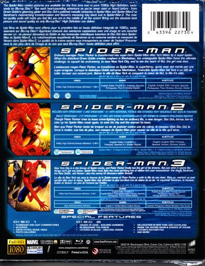 The Spider-Man motion pictures are available for the first time ever in pure 1080p High Definition, exclusively on Blu-ray Disc! See each heart-pounding adventure as you've never before seen or heard - from Goblin's gleaming glider and Venom's menacing inky black suit in Spider-Man 3. The fully uncompressed master quality audio will make you feel like you are in the middle of all the action! Bring out the absolute best picture and sound quality as only Blu-ray Disc High-Definition can deliver.Spider-Man:Ordinary teenager Peter Parker is transformed into Superhero Spider-Man after he's bitten by a super-spider. When the Evil Green Goblin creates mayhem in Manhattan, the unstoppable Spider-Man faces the ultimate challenge: to squash his arch-enemy, to save New York City, and to win the heart of MJ.Spider-Man 2:Though Peter Parker tries to leave crime-fighting to live an ordinary life, a new danger, Doc Ock, forces him to take up his Spider-Man mask again, to save his city and the woman he loves.Spider-Man 3:New York City is in the throes of Spider-Mania, and Peter Parker finally has the girl of his dreams. But just when it seems like things can't get any better, Spider-Man must fight the most terrifying trio of villains he's ever encountered - the deadly Sandman, the New Goblin, and Venom - Plus the enemy he discovers within himself.