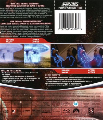 STAR TREK: THE NEXT GENERATION LIKE YOU'VE NEVER SEEN OR HEARD IT BEFORE!For the first time ever, you can experience all 25 season one episodes in glorious 1080p high definition, with true high definition visual effects and English language digitally remastered 7.1 sound - or with the original audio. You'll witness new picture detail and depth and enjoy sepctacular visual effects that have been painstakingly re-created from the original film elements...not upconverted from videotape! Join Captain Jean-Luc Picard (Patrick Stewart) and the entire crew of the Enterprise on a voyage to the next generation...of Star Trek: The Next Generation.