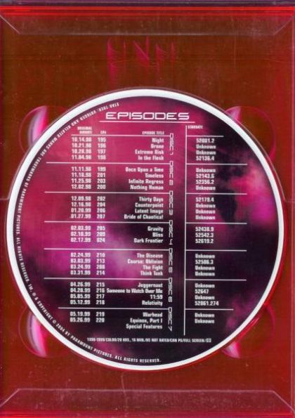 7-Disc set featuring over 20 hours of Entertainment.25 Original Broadcast Episodes, Available for the first time in 5.1 Surround.Disc 1OriginalAirdate EP# Episode Title Stardate10.14.98 195 Night 52081.210.21.98 196 Drone Unknown10.28.98 197 Extreme Risk Unknown11.04.98 198 In the Flesh 52136.4Disc 2OriginalAirdate EP# Episode Title Stardate11.11.98 199 Once Upon a Time Unknown11.18.98 201 Timeless 52143.611.25.98 203 Infinite Regress 52356.212.02.98 200 Nothin' Human UnknownDisc 3OriginalAirdate EP# Episode Title Stardate12.09.98 202 Thirty Days 52179.412.16.98 204 Counterpoint Unknown01.20.99 206 Latent Image Unknown01.27.99 207 Bride of Chaotica! UnknownDisc 4OriginalAirdate EP# Episode Title Stardate02.03.99 205 Gravity 52438.902.10.99 209 Bliss 52542.302.17.99 824 Dark Frontier, Part I 52619.2Disc 5OriginalAirdate EP# Episode Title Stardate02.24.99 210 The Disease Unknown03.03.99 213 Course: Oblivion 52586.303.24.99 208 The Fight Unknown03.31.99 214 Think Tank UnknownDisc 6OriginalAirdate EP# Episode Title Stardate04.26.99 215 Juggernaut Unknown04.28.99 216 Someone to Watch Over Me 5264705.05.99 217 11:59 Unknown05.12.99 218 Relativity 52861.274Disc 7OriginalAirdate EP# Episode Title Stardate 21805.19.99 219 Warhead Unknown05.26.99 220 Equinox Unknown