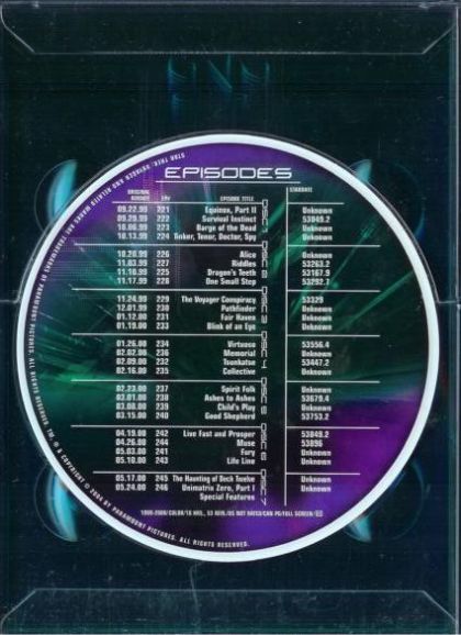 7-Disc set featuring over 18 hours of Entertainment.26 Original Broadcast Episodes, Available for the first time in 5.1 Surround.Disc 1OriginalAirdate EP# Episode Title Stardate09.22.99 221 Equinox, Part II Unknown09.29.99 222 Survival Instinct 53049.210.06.99 223 Barge Of The Dead Unknown10.13.99 224 Tinker, Tenor, Doctor, Spy UnknownDisc 2OriginalAirdate EP# Episode Title Stardate11.24.99 226 Alice Unknown11.03.99 227 Riddles 53263.211.10.99 225 Dragon's Teeth 53167.911.17.99 228 One Small Step 53292.7Disc 3OriginalAirdate EP# Episode Title Stardate11.24.99 229 The Voyager Conspiracy 5332912.01.99 230 Pathfinder Unknown01.12.00 231 Fairhaven Unknown01.19.00 233 Blink Of An Eye UnknownDisc 4OriginalAirdate EP# Episode Title Stardate01.26.00 234 Virtuoso 53556.402.02.00 236 Memorial Unknown02.09.00 232 Tsunkatse 53447.202.16.00 235 Collective UnknownDisc 5OriginalAirdate EP# Episode Title Stardate02.23.00 237 Spirit Folk Unknown03.01.00 238 Ashes To Ashes 53679.403.08.00 239 Child's Play Unknown03.15.00 240 Good Shepherd 53753.2Disc 6OriginalAirdate EP# Episode Title Stardate04.19.00 242 Live Fast And Prosper 53849.204.26.00 244 Muse 5389605.03.00 241 Fury Unknown05.10.00 243 Life Line UnknownDisc 7OriginalAirdate EP# Episode Title Stardate 21805.17.00 245 The Haunting Of Deck Twelve Unknown05.24.00 246 Unimatrix Zero, Part I UnknownSpecial FeaturesAdditional limited bonus 8th disc: (Limited on first run only)Star Mapping The Final Frontier - Former Voyager illustrator Geoffrey mandel details how he mapped the entire Star Trek universe, which resulted in the book Star Trek Star Charts