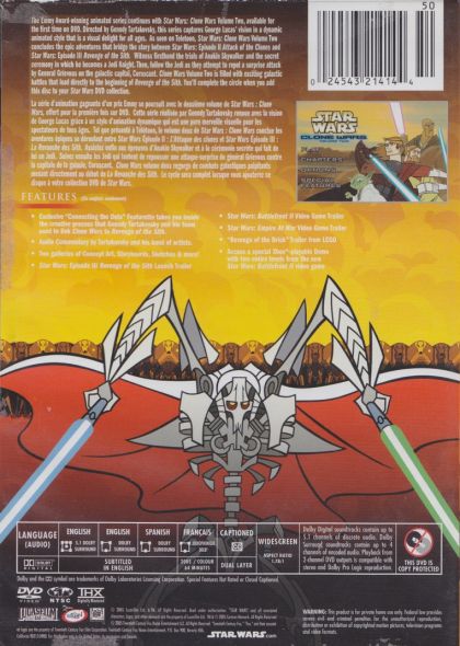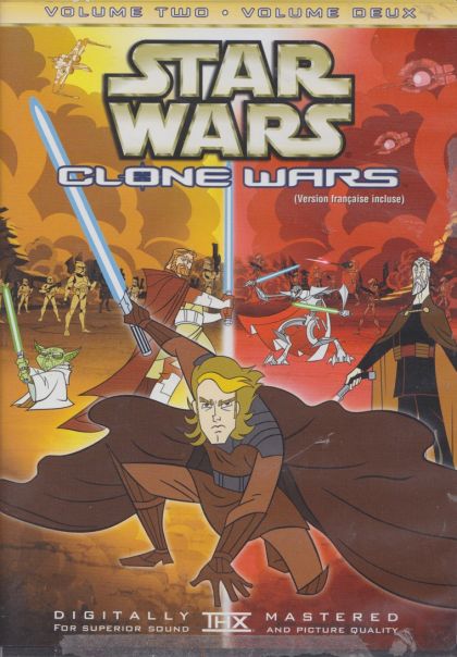 The Emmy Award-winning animated series continues with Star Wars: Clone Wars Volume Two, available for the first time on DVD. Directed by Genndy Tartakovsky, this series captures George Lucas' vision in a dynamic animated style that is a visual delight for all ages. As seen on Teletoon, Star Wars: Clone Wars Volume Two concludes the epic adventures that bridge the story betwen Star Wars: Episode II Attack of the Clones and Star Wars: Episode III Revenge of the Sith. Witness firsthand the trials of Anakin Skywalker and the secret ceremony in which he becomes a Jedi Knight. Then, follow the Jedi as they attempt to repel a surprise attack by General Grievous on the galactic capital, Coruscant. Clone Wares Volume Two is filled with exciting galactic battles that lead directly to the begining of the Sith. You'll complete the circle when you add this disc to your Star Wars DVD collection.