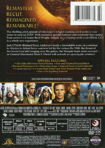 Remastered. Recut. Reimagined...Remarkable! The thrilling pilot episode of television's longest running Sci-Fi series is now yours to own on DVD! With exclusive special features and masterful fine-tuning from series Co-Creator Brad Wright, Children Of The Gods FINAL CUT is a whole new experience.Jack O'Neil (Richard Dean Anderson) leads a formidable team on a mission to Abydos to defeat fierce warriors led by the vicious Ra. With the threat of the brutal Goa'uld hanging over the galaxy, the Stargate team must succeed - or General Hammond (Don S. Davis) will unleash an apocalyptic solution!