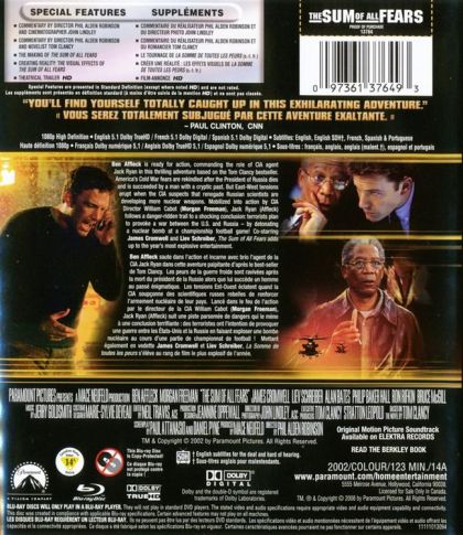 Ben Affleck is ready for action, commanding the role of CIA agent Jack Ryan in this thrilling adventure based on the Tom Clancy bestseller. America's cold war fears are rekindled after the President of Russia dies and is succeeded by a man with a cryptic past. But East-West tensions erupt when the CIA suspects the renegade Russian scientists are developing more nuclear weapons. Mobilized into action by CIA director William Cabot (Morgan Freeman), Jack Ryan follows a danger ridden trail to a shocking conclusion: terrorist plans to provoke a war between US and Russia - by detonation a nuclear bomb at a championship football game! Co-starring James Cromwell and Liev Schreiber, The Sum of all Fears adds up to the year's most explosive entertainment.Ben Affleck saute dans l'action et incarne avec brio l'agent de la CIA Jack Clancy. Les peurs de la guerre froide sont ravivées après la mort du président de la Russie alors que lui succède un homme au passé énigmatique. Les tensions Est-Ouest éclatent et quand la CIA soupçonne de scientifiques russes rebelles de renforcer l'armement nucléaire de leur pays. Lancé dans le feu de l'action Jack Ryan (Affleck) suit une piste parsemée de dangers qui le mêne à une conclusion terrifiante : des terroristes ont l'intention de provoquer une guerre entre les États-Unis et la Russie en faisant exploser une bombe nucléaire au cours d'une partie de championnat de football ! Mettant également en vedette James Cromwell et Liev Schreiber, La Somme de toutes les peurs s'élève au rang de film le plus explosif de l'année.