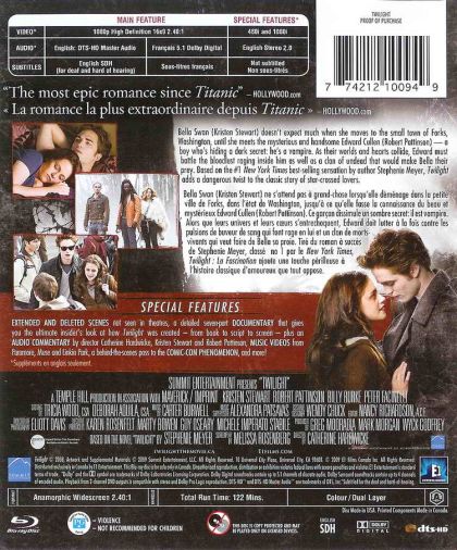 Bella Swan (Kristen Stewart) doesn't expect much when she moves to the small town of Forks, Washington, until she meets the mysterious and handsome Edward Cullen (Robert Pattinson) - a boy who's hiding a dark secret: he's a vampire. As their worlds and hearts collide, Edward must battle the bloodlust raging inside him as well as a clan of undead that would make Bella their prey. Based on the #1 New York Times best-selling sensation by author Stephenie Meyer, Twilight adds a dangerous twist to the classic story of star-crossed lovers.Bella Swan (Kristen Stewart) ne s’attend pas à grand-chose lorsqu’elle déménage dans la petite ville de Forks, dans l’état de Washington, jusqu’à ce qu’elle fasse la connaissance du beau et mystérieux Edward Cullen (Robert Pattinson). Ce garçon dissimule un sombre secret : il est vampire. Alors que leurs univers et leur cœurs s’entrechoquent, Edward doit lutter à la fois contre les pulsions de buveur de sang qui font rage en lui et un clan de mort-vivants qui veut faire de Bella sa proie. Tiré du roman à succès de Stephenie Meyer, classé no 1 par le New York Times, Twilight : La Fascination ajoute une touche périlleuse à l’histoire classique d’amoureux que tout oppose.