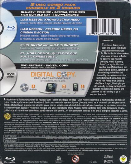 The star of Taken jumps back into action with brute force! Liam Neeson plays Dr. Martin Harris, who awakens after a car accident in Berlin to discover that his wife (January Jones) suddenly doesn't recognize him and another man (Aidan Quinn) has assumed his identity. Ignored by disbelieving authorities and hunted by mysterious assassins, he finds himself alone, tired and on the run. Aided by an unlikely ally (Diane Kruger), Harris plunges into a deadly mystery forcing him to question his sanity, his identity and just how far he's willing to go to uncover the truth.La vedette de L’Enlèvement plonge de nouveau dans l’action et attaque en force! Liam Neeson incarne le Dr. Martin Harris, un médecin qui se réveille après un accident de voiture à Berlin pour constater que son épouse (January Jones) ne le reconnaît plus et qu’un autre homme (Aidan Quinn) a usurpé son identité. Ignoré par les autorités qui refusent de le croire et pourchassé par de mystérieux assassins, il se retrouve seul, épuisé et recherché. Aide par une alliée improbable (DianeKruger), Harris s’enfonce dans cette dangereuse énigme qui le forcera à remettre en question sa santé mentale, son identité… et à se demander jusqu’où il est prêt à aller pour découvrir la vérité.