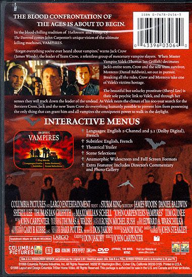 THE BLOOD CONFRONTATION OF THE AGES IS ABOUT TO BEGINIn the blood-chilling tradition of Halloween and Village of the Damned comes John Carpenter's unique vision of the ultimate killing machines, VAMPIRES."Forget everything you've ever heard about vampires," warns Jack Crow (James Woods), the leader of Team Crow, a relentless group of mercenary vampire slayers. When Master Vampire Valek (Thomas Ian Griffith) decimates Jack's entire team, Crow and the sole team survivor, Montoya (Daniel Baldwin), set out in pursuit. Breaking all the rules, Crow and Montoya take one of Valek's victims hostage.A beautiful but unlucky prostitute (Sheryl Lee) is their sole psychic link to Valek, and through her sense they will track down the leader of the undead. As Valek nears the climax of his 600-yer search for the Beziers Cross, Jack and the new Team Crow do everything humanly possible to prevent him from possessing the only thing that can grant him and all vampires the omnipotent power to walk in daylight.