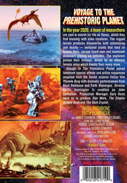 In the year 2020, cosmonaut Marcia (Faith Domergue) orbits the planet Venus while two astronauts and a robot journey on the surface. Professor Hartman (Basil Rathbone) is also on hand to observe the exploration from a distance. The explorers are attacked by prehistoric beasts, and then nearly lose their robot (and their lives!) in a volcanic eruption that engulfs the planet. They conclude that the Venusians were really human beings who destroyed their civilization with nuclear warfare.Voyage To The Prehistoric Planet paired landmark special effectsand action sequences acquired from the Soviet science fiction film Planet Burg with dramatic performances from Basil Rathbone and Faith Domergue. Director Curtis Harrington is credited as John Sebastian. Production manager Gary Kurtz went on to produce Star Wars, The Empire Strikes BAck and the Dark Crystal.