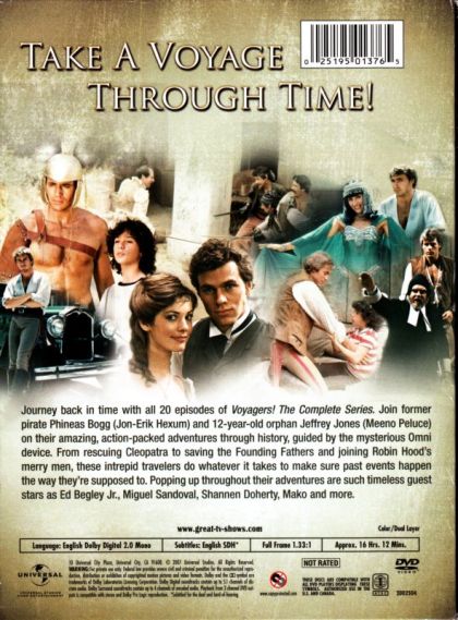 Journey back in time with all 20 episodes of Voyagers! The Complete Series. Join former pirate Phineas Bogg (Jon-Erik Hexum) and 12-year-old orphan Jeffrey Jones (Meeno Peluce) on their amazing, action-packed adventures through history, guided by the mysterious Omni device, a compass-like object that directs their adventures through time. From rescuing Cleopatra to saving the Founding Fathers and joining Robin Hood's merry men, these intrepid travelers do whatever it takes to make sure past events happen the way they're supposed to. Popping up throughout their adventures are such timeless guest stars as Ed Begley Jr.,Miguel Sandoval, Shannen Doherty, Mako and more.