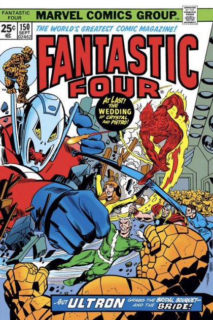 The attack on the wedding of Crystal and Quicksilver continues from where it left off in "Avengers, Vol. 1 #127." The two superteams face off against Ultron in his new, more powerful body, but none have the power required to stop the mechanical maniac. Their salvation comes in the least likely of forms. With the threat eliminated, they can now enjoy the nuptuals.