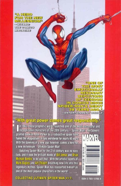 "With great power—comes great responsibility." In 1963, these prophetic words launched one of the most successful and recognizable characters of the 20th century… Spider-Man! The powers granted bookish Peter Parker by a radioactive spider have fueled the imagination of fans worldwide for nearly 40 years. With the dawning of a new age, however, come a hero for the new millennium... Ultimate Spider-Man! Updating Spider-Man for the 21st Century was no easy task, and it took the brilliant mind of Brian Michael Bendis to do just that. With the artistic talents of Mark Bagley and Art Thibert breathing new life into this legendary mythos, Spider-Man has reasserted himself as one of the most popular characters in the world!]