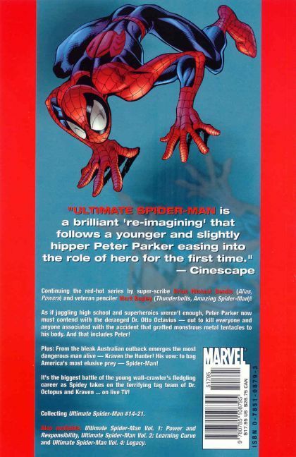Continuing the red-hot series by super-scribe Brian Michael Bendis (Alias, Powers) and veteran penciler Mark Bagley (Thunderbolts, Amazing Spider-Man)! As if juggling high school and superheroics weren't enough, Peter Parker must now contend with the deranged Dr. Otto Octavius—out to kill everyone and anyone associated with the accident that grafted monstrous metal tentacles to his body. And that includes Peter! Plus fromt he bleak Australian outback emerges the most dangerous man alive—Kraven the Hunter! His vow: to bag America's most elusive prey—Spider-Man! It's the biggest battle of the young wall-crawler's fledgling career as Spidey takes on the terrifying tag team of Dr. Octopus and Kraven... on live TV!]