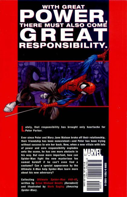 With great power, there must also come great responsibility. Lately, that responsibility has brought only heartache for Peter Parker. Ever since Peter and Mary Jane Watson broke off their relationship, their friendship has been nonexistent - and Peter has been trying without success to win her back. Now, when a new villain with lots of power and zero responsibility explodes onto the scene, he has one more obstacle in his way. But even more important, how can Spider-Man fight the mysterious new foe named Geldoff is he can't even find a costume? Can a special appearance by the Ultimate X-Men help Spider-man learn more about his adversary?