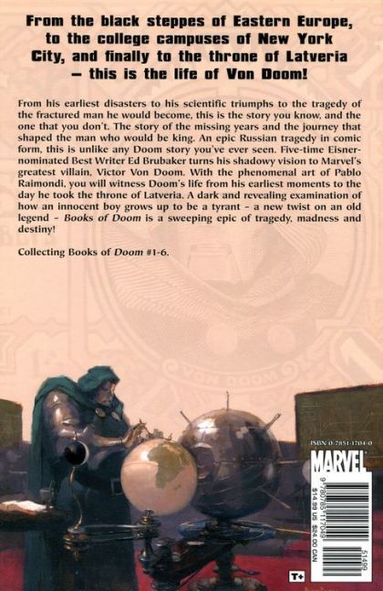 Five-time Eisner-nominated Best Writer Ed Brubaker turns his shadowy vision to Marvel's greatest villain, Victor Von Doom. With the phenomenal art team of Pablo Raimondi and Mark Farmer, you will witness Doom's life from his earliest moments to the day he took the throne of Latveria. A dark and revealing examination of how an innocent boy grows up to be a tyrant - a new twist on an old legend - Books of Doom is a sweeping epic of tragedy, madness and destiny!