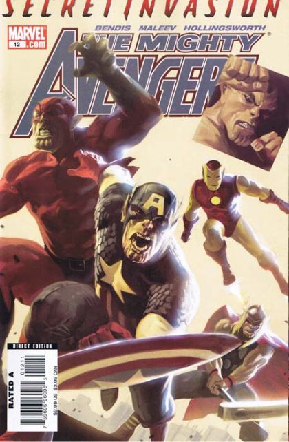 Flashing back to scenes from "Secret War" and "Spider-Woman: Origin," we learn what Nick Fury has been up to. A Skrull disguised as the Countess tried to get information from him, but he knew something was up and killed her, causing her to revert back to her natural form. With this tip-off, he visited Maria Hill and Spider-Woman to deliver warnings and solicit help. He promises to put the pieces together for the sake of humanity. We see an assortment of images of various heroes, some of which Fury has circled in blue, and some of which he's circled in red.