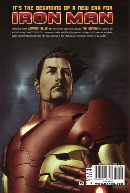 Written by WARREN ELLIS Penciled by ADI GRANOV Variant Cover by ADI GRANOV It's the beginning of a new era for Iron Man! Renowned scribe Warren Ellis joins forces with acclaimed illustrator Adi Granov to redefine the armored avenger's world for the 21st century - a landscape of terrifying new technologies that threaten to overwhelm fragile mankind! What is Extremis, who has unleashed it, and what does its emergence portend for the world? Plus: this new edition comes packed with extras, including armor designs, page layouts, issue scripts and more! Collecting Iron Man (2005) #1-6. 184 PGS./Rated T+ ?$24.99