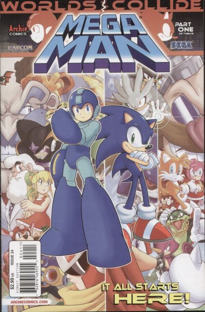 'Worlds Collide,' Part One. The crossover event of 2013 starts here! The Mega Man/Sonic the Hedgehog epic kicks off with a bang as the Blue Blur and Blue Bomber meet for the first time! And considering how hard they're fighting each other, it might be the last! Why are the heroes trying to take each other down? Drs. Eggman and Wily know, and they're loving every minute of it! You cannot miss this historic first meeting of two of the biggest video game icons in the entire world! Get in on the ground floor with all-new cover art by the legendary Patrick 'SPAZ' Spaziante, and choose your favorite hero with the 'Team Sonic' and 'Team Mega Man' variant covers!
