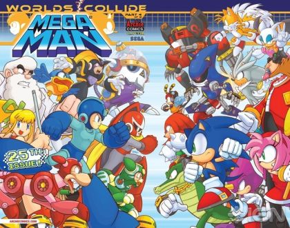 'When Worlds Collide,' Part 4 of 12. It's Sonic versus Mega Man - Round Two! Celebrate 25 issues of Mega Man with the throwdown brawl to end all throwdown brawls! The Blue Bomber has the home field advantage this time; can Sonic keep up in this unfamiliar city? Meanwhile, Drs. Eggman and Wily make their boldest move yet in their master plan! This milestone issue marks the dramatic conclusion to the first act in the biggest crossover story of 2013! Featuring a stunning gatefold cover by Sonic/Mega Man art legend Patrick Spaziante, and a special 'E.F.F. (aka Evil Friends Forever) variant' featuring Drs. Eggman and Wily on a (presumably evil) bicycle built for two!