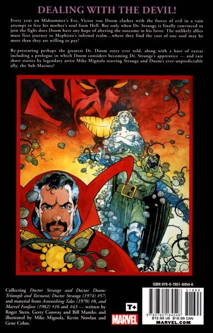 Every year on Midsummer's Eve, Victor von Doom clashes with the forces of evil in a vain attempt to free his mother's soul from Hell. But only when Dr. Strange is finally convinced to join the fight does he have any hope of altering the outcome in his favor. The unlikely allies must first journey to Mephisto's infernal realm, where they find the cost of one soul may be more than they are willing to pay! Collecting DOCTOR STRANGE AND DOCTOR DOOM : TRIUMPH AND TORMENT; DOCTOR STRANGE (1974) #57; and material from ASTONISHING TALES (1970) #8, and MARVEL FANFARE (1982) #16 and #43.