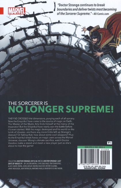 They have crossed the dimensions, purging them all of sorcery, one by one. Now the Empirikul are here. And with Earth's Master of the Mystic Arts weakened beyond measure, is there any chance of stopping them? The Sorcerer is no longer Supreme, and he will find himself at the mercy of the Imperator! With his magic destroyed and his world on the brink of disaster, are there any more tricks left up Strange's sleeves? Or failing that, how about some cool weapons? Plus: As the Empirikul wreaks havoc on magic users throughout the Marvel Universe, discover Wong's ultimate sacrifice, watch Brother Voodoo make a stand and meet a new player just as she is about to lose the game! Collecting DOCTOR STRANGE (2015) #6-10 and DOCTOR STRANGE: LAST DAYS OF MAGIC #1. Rated T+