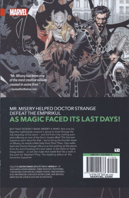 As magic faced its last days, Mr. Misery helped Doctor Strange defeat the Empirikul. But that doesn't make Misery a hero. Not one bit. Now, the nightmarish creature is about to show Strange the full meaning of his name - and he'll do it by visiting pain and suffering on one of the Doc's closest allies! The Sorcerer Supreme won't stand for that - but to bring the thunder down on Misery, he needs a little help from Thor! Then, Clea walks back into Doctor Strange's life just as he's picking up the pieces from the worst beating he's ever taken. Is she there to help - or will she make that battle feel like a walk in the park for Stephen? Plus: The dazzling debut of the Sorcerers Supreme! Collecting DOCTOR STRANGE (2015) #17-20 and ANNUAL #1. Rated T+