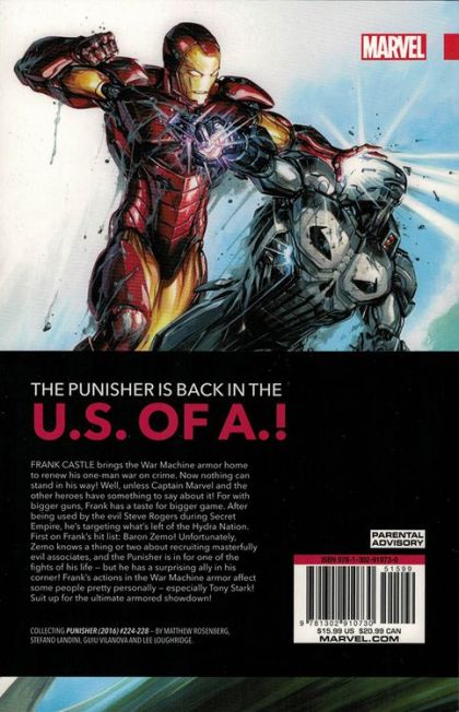Back in the U.S. of A.! Frank Castle brings the War Machine armor home to renew his one-man war on crime. Now nothing can stand in his way! Well, unless Captain Marvel and the other heroes have something to say about it! For with bigger guns, Frank has a taste for bigger game. After being used by the evil Steve Rogers during Secret Empire, Frank's targeting what's left of the Hydra Nation. First on Frank's hit list: Baron Zemo! Unfortunately, Zemo knows a thing or two about recruiting masterfully evil associates, and the Punisher is in for one of the fights of his life - but he has a surprising ally in his corner! Frank's actions in the War Machine armor affect some people pretty personally - especially Tony Stark! Suit up for the ultimate armored showdown! Collecting PUNISHER (2016) #224-228. Parental Advisory