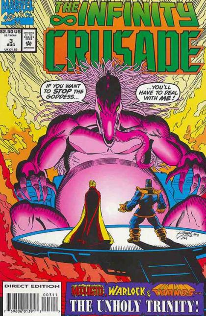 Warlock finds himself in an unholy alliance with Mephisto in 48 pages of cosmic excitement! Meanwhile, the Goddess's converted heroes prepare for a major strike against the unconverted. The adventure in the third book of Jim Starlin's Infinity trilogy will astonish readers!