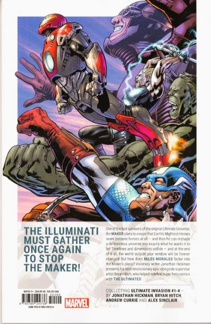 The Illuminati must gather once again to stop the Maker! One of the last survivors of the original Ultimate Universe, the Maker plans to ensure that Earth's Mightiest Heroes never become heroes at all - and then he can reshape a defenseless universe into exactly what he wants it to be! Timelines and dimensions collide - and at the end of it all, the world outside your window will be forever changed! But how does Miles Morales factor into the Maker's plans? Fresh from masterminding the Krakoan era of X-Men, visionary writer Jonathan Hickman presents his next revolutionary epic alongside superstar artist Bryan Hitch, who helped redefine super-hero comics with THE ULTIMATES! Collecting ULTIMATE INVASION #1-4. Rated T+