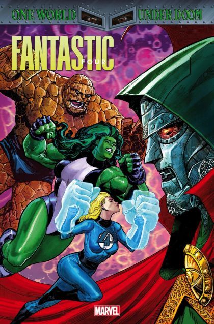 The impossible has happened! DOCTOR DOOM has taken over the world! And the Fantastic Four are NOT going to let that stand. As Reed locks himself in his lab, trying to solve the Problem of Doom, Ben treats Sue to a trip to NYC with their mutual friend, JEN 'SHE-HULK' WALTERS, to help get her mind off of things. But tensions after vampires overran the world in their Blood Hunt remain, and when Ben, Sue and Jen find themselves on the wrong side of mob justice, they face a choice...and it's one they will not be able to take back! Rated T