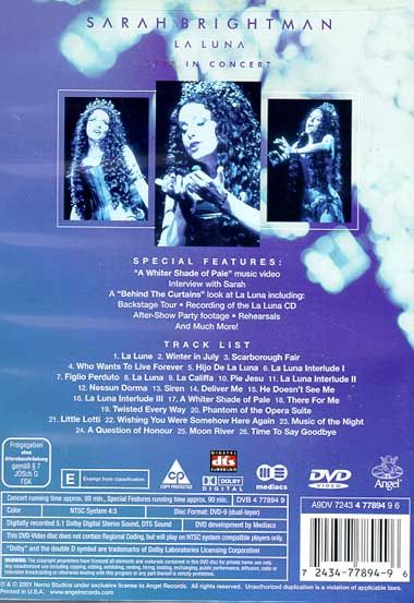 Superstar crossover vocalist Sarah Brightman greets the new millennium with a bold sense of her unique musical niche in this live concert, La Luna. Drawing heavily from her same-titled CD, the material touches on images of the moon that reinforce its ambiguity as a force known to draw together "the lunatic, the lover, and the poet" (Brightman's revealing woodsy outfits and tinsel crown do seem to suggest a sort of Titania-like figure out of a New Age Midsummer Night's Dream). And it's a stylistic as well as thematic voyage, coursing from contemporary synth pop through gorgeously sinuous melodies of classical composers (one song, "Figlio Perduto," even adapts the slow movement of Beethoven's Seventh Symphony) as well as selections from her earlier albums: "There for Me" (a duet with Josh Groban), Puccini's "Nessun Dorma," "Time to Say Goodbye" (performed without Andrea Bocelli), and ex-husband Andrew Lloyd Webber's "Pie Jesu" and "Music of the Night." Limiting stage action to arm gestures, some dancers, and a couple of flying maneuvers (most notably amid a shower of sparks in "A Question of Honour"), executive producer Frank Peterson (who produced the CD) and stage director Bruce Gowers swath Brightman's shiny small voice in luxuriant fabrics of sound. Detractors will lament the resulting sameness of tone--no matter what the style involved--but Brightman's focus on spinning an ethereal spell is never eclipsed. -- Thomas May