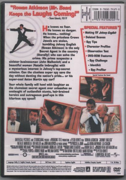 Mr. Bean meets Mr. Bond in Johnny English, a spy spoof that skewers the genre with Rowan Atkinson's trademark brand of veddy-British slapstick. It's a bit half-baked as a wannabe franchise, but Atkinson's creation of a new screen persona is just promising enough to warrant a sequel, despite critics' complaints that Austin Powers had already exhausted the spy-spoof's potential. Poppycock! Atkinson's gift for physical and, in this case, even verbal humor will surely please his devoted fans, even when a rather tepidly comedic screenplay prevents the British funnyman from reaching new heights of absurdity. As bumbling superspy Johnny English, who gains top-level MI-7 clearance after inadvertently causing a colleague's demise, Atkinson breathes life into gags that are too familiar to earn such an amusing revival. With John Malkovich as a smarmy Frenchman determined to overthrow the British monarchy, and Natalie Imbruglia as Johnny's comely comrade-in-arms, this slight but enjoyable comedy gives Atkinson plenty of opportunity to mug it up as only he can. --Jeff Shannon