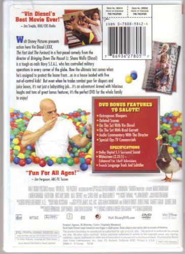Vin Diesel is game to soften his tough-guy image in The Pacifier, in which he plays hot-shot Navy S.E.A.L. Shane Wolfe, whose latest mission goes awry when the scientist he's sent to rescue is popped off before he can tell Wolfe where he's hidden some Top Secret software something-or-other. Before you can say Kindergarten Cop, Wolfe is assigned guard duty at the scientist's family home, where he's left with some unruly kids when the widow (Faith Ford) takes off to Switzerland to claim her hubby's safety deposit box under the guidance of Wolfe's superior officer. The trouble with this paint-by-numbers fish-out-of-water kiddie comedy is that Diesel himself is a fish out of water in the movie--he's no comic and is far funnier when he's unintentionally spoofing macho heroics in The Chronicles of Riddick. The film limply throws everything it can at you, including the idea of Wolfe directing a community theater production of The Sound of Music, but is just biding its time until the predictable action climax and hugs-all-around denouement. Vin doesn't look embarrassed, but the supporting cast sure does, especially Everybody Loves Raymond's Brad Garrett as a bombastic vice principal and Gilmore Girls' Lauren Graham as Garrett's boss and Diesel's sudden love interest.--Steve Wiecking