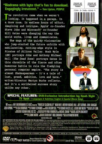 If Gates has become synonymous with corporate conquest at its most striking, Pirates' interest lies more with Jobs, given a nervous energy and flashes of adolescent selfishness by Noah Wyle, who benefits from a reasonable physical resemblance to the Apple chief. Eyewear and a comb-over do nearly as well for Anthony Michael Hall, who also grafts some of Bill Gates's better-known mannerisms onto his performance and renders Gates as a smart if socially maladroit entrepreneur who, like Jobs, provides the ambition and business savvy to exploit his partner's computing talents. There are a few fanciful touches (Ballmer and Wozniak become Greek choruses, addressing the viewer as they comment on the principals), but the story plays out in straightforward fashion. It's tantalizing to consider how the Apple/PC melodrama might have fared with an edgier, more openly satirical script. --Sam Sutherland