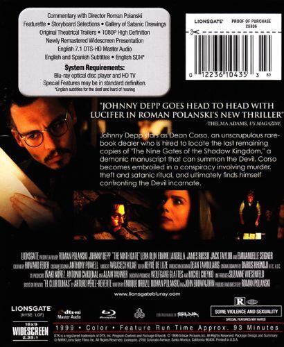 Wealthy publisher Boris Balkan (Frank Langella) has obtained a copy of an exceedingly rare book called 'The Nine Gates of the Kingdom of Shadows.' The 17th century tome is supposed to explain the procedure for summoning Satan and is rumored to have been authored by the Devil himself. Balkan hires Dean Corso (Johnny Depp), a book dealer who skirts the law more often than he should, to track down the two other copies of the book in Europe. Balkan claims to believe that his copy is a forgery but Corso quickly discovers there is more to Balkan’s quest than he thought as those associated with the book begin to succumb to bizarre deaths that mimic the morbid illustrations. An otherworldly girl (Emmanuelle Seigner) seems to both pursue and aid Corso as he attempts to gather the books together before they can be taken by rival searcher Liana Telfer (Lena Olin).