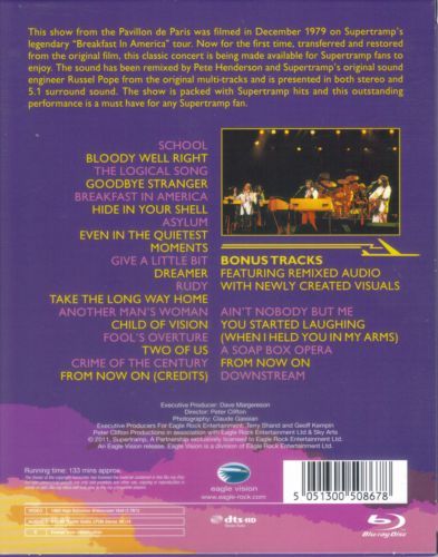 Supertramp’s “Breakfast In America” was the biggest selling album in the world in 1979. It spawned several hit singles and went on to win two Grammy Awards and sell in excess of 20 million copies. Following the album’s release Supertramp embarked on a 10 month world tour which arrived in Paris at the end of November. This show from the Pavillon de Paris was both filmed and recorded. The audio went on to form the basis of the 1980 live album “Paris” but the film was never released. Now for the first time, transferred and restored to full HD from the original 16mm film, this footage is available to Supertramp’s legion of fans worldwide. The sound has been remixed by original sound engineer and co-producer Pete Henderson from the original multi-tracks and can now be heard in 5.1. This is a legendary show by a legendary band performing at their absolute peak and is a must for any Supertramp fan.