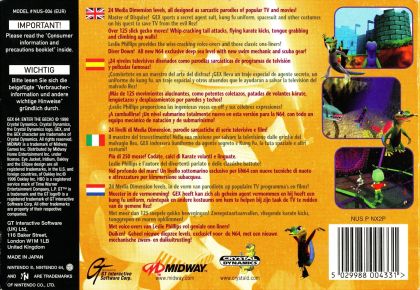 The ultimate free-roaming 3D experience! 24 Media Dimension levels, all designed as sarcastic parodies of popular TV and movies! Master of Disguise GEX sports a secret agent suit, kung fu uniform, spacesuit and other costumes on his quest to save TV from the evil Rez! Over 125 slick gecko moves. Whip-cracking tail attacks, flying karate kicks, tongue-grabbing and climbing up walls. All-new N64 exclusive deep sea level with new swim mechanics and scuba gear!