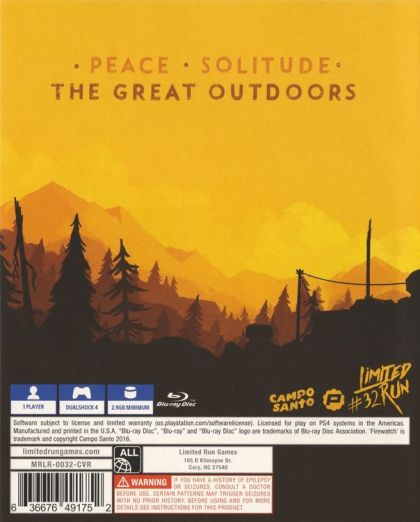 The year is 1989. You are a man named Henry who has retreated from his messy life to work as a fire lookout in the Wyoming wilderness. Perched high atop a mountain, its your job to look for smoke and keep the wilderness safe. An especially hot, dry summer has everyone on edge. Your supervisor Delilah is available to you at all times over a small, handheld radioyour only contact with the world you've left behind. But when something strange draws you out of your lookout tower and into the forest, youll explore a wild and unknown environment, facing questions and making choices that can build or destroy the only meaningful relationship you have. A Note: Firewatch is a video game about adults having adult conversations about adult things. If you plan on playing with a younger gamer, that might be good to know going in. Includes * A stunningly beautiful wilderness environment that expands as you explore. * A tailor-made story: the choices you make shape the narrative and build relationships. * An edge-of-your-seat mystery. * Secrets and discoveries to be made over every hill.