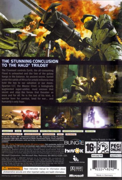 In "Halo 3," the third installment of this legendary epic, the war has come to a climax -- the Flood continue to grow in numbers and strength, the armies of Earth are scattered and decimated, and the Covenant threaten to activate the Halo, effectively destroying all life in the galaxy. Master Chief's mission: to stop the Covenant, destroy the impending Flood threat and ultimately save mankind.