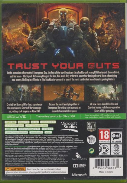 "Gears of War: Judgment" delivers the most intense and challenging "Gears of War" game yet, with a campaign that takes you back to the immediate aftermath of Emergence Day -the defining event of the "Gears of War" universe -for the very first time and tests your mettle in highly competitive new multiplayer modes.