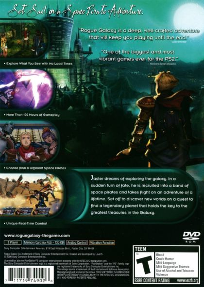 From the developers of the critically acclaimed Dark Cloud series, Level-5 once again delivers an unparalleled role-playing game experience with the introduction of Rogue Galaxy. Rogue Galaxy provides RPG fans with visually stunning backdrops, an immersive storyline with plenty of unexpected twists, and a proprietary combat system that gives the player total control of an epic adventure.