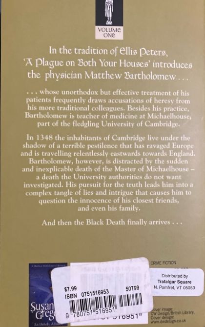 In the tradition of Ellis Peters, A Plague on Both Your Houses introduces the physician Matthew Bartholomew, whose unorthodox but effective treatment of his patients frequently draws accusations of heresy from his more traditional colleagues. Besides his practice, Bartholomew is teacher of Medicine at Michaelhouse, part of the fledgling University of Cambridge. In 1348, the inhabitants of Cambridge live under the shadow of a terrible pestilence that has ravaged Europe and is travelling relentlessly eastward towards England. Bartholomew, however, is distracted by the sudden and inexplicable death of the Master of Michaelhouse - a death the University authorities do not want investigated. When three more scholars die in mysterious circumstances, Bartholomew defies the University and begins his own enquiry. His pursuit for the truth leads him into a complex tangle of lies and intrigue that causes him to question the innocence of his closest friends, and even his family. And then the Black Death finally arrives and Bartholomew is dragged deeper and deeper into a quagmire which threatens not only his life, but the continued existence of the University and the future of the town.