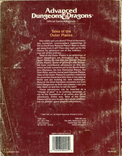 Tales of the Outer Planes is an anthology of short adventures set throughout the many Outer Planes for use with the AD&D Manual of the Planes. Some of gaming's best designers have contributed adventures to this set, which includes scenarios set in the Seven Heavens, Olympus, the four Elemental Planes, the Nine Hells, and the Astral and Ethereal Planes. Tales of the Outer Planes is a perfect collection for powerful characters who have it too easy at home and are looking for new challenges. Many of the most fearsome monsters are even more dangerous on their own planes - can you take them on and live to tell the tale?