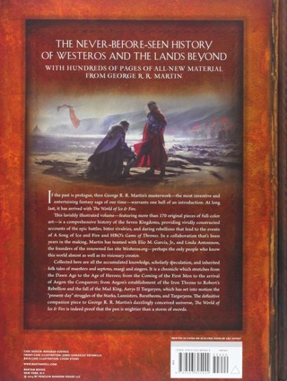NEW YORK TIMES BESTSELLER • Perfect for fans of A Song of Ice and Fire and HBO’s Game of Thrones—an epic history of Westeros and the lands beyond, featuring hundreds of pages of all-new material from George R. R. Martin!If the past is prologue, then George R. R. Martin’s masterwork—the most inventive and entertaining fantasy saga of our time—warrants one hell of an introduction. At long last, it has arrived with The World of Ice & Fire.This lavishly illustrated volume is a comprehensive history of the Seven Kingdoms, providing vividly constructed accounts of the epic battles, bitter rivalries, and daring rebellions that lead to the events of A Song of Ice and Fire and HBO’s Game of Thrones. In a collaboration that’s been years in the making, Martin has teamed with Elio M. García, Jr., and Linda Antonsson, the founders of the renowned fan site Westeros.org—perhaps the only people who know this world almost as well as its visionary creator.Collected here is all the accumulated knowledge, scholarly speculation, and inherited folk tales of maesters and septons, maegi and singers, including • full-color artwork and maps, with more than 170 original pieces • full family trees for Houses Stark, Lannister, and Targaryen • in-depth explorations of the history and culture of Westeros • 100% all-new material, more than half of which Martin wrote specifically for this bookThe definitive companion piece to George R. R. Martin’s dazzlingly conceived universe, The World of Ice & Fire is indeed proof that the pen is mightier than a storm of swords.