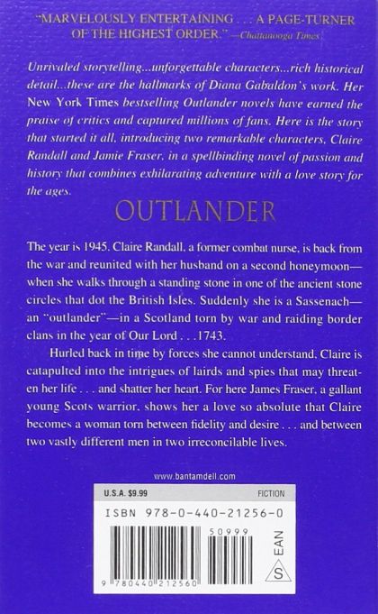 #1 NEW YORK TIMES BESTSELLER • The first book in Diana Gabaldon’s acclaimed Outlander saga, the basis for the Starz original series. One of the top ten best-loved novels in America, as seen on PBS’s The Great American Read! Unrivaled storytelling. Unforgettable characters. Rich historical detail. These are the hallmarks of Diana Gabaldon’s work. Her New York Times bestselling Outlander novels have earned the praise of critics and captured the hearts of millions of fans. Here is the story that started it all, introducing two remarkable characters, Claire Beauchamp Randall and Jamie Fraser, in a spellbinding novel of passion and history that combines exhilarating adventure with a love story for the ages. Scottish Highlands, 1945. Claire Randall, a former British combat nurse, is just back from the war and reunited with her husband on a second honeymoon when she walks through a standing stone in one of the ancient circles that dot the British Isles. Suddenly she is a Sassenach—an “outlander”—in a Scotland torn by war and raiding clans in the year of Our Lord . . . 1743. Claire is catapulted into the intrigues of a world that threatens her life, and may shatter her heart. Marooned amid danger, passion, and violence, Claire learns her only chance of safety lies in Jamie Fraser, a gallant young Scots warrior. What begins in compulsion becomes urgent need, and Claire finds herself torn between two very different men, in two irreconcilable lives.