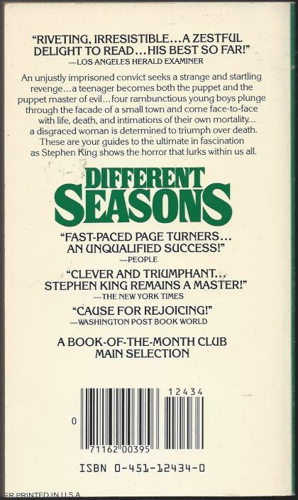 "This gripping collection begins with 'Rita Hayworth and the Shawshank Redemption,' in which an unjustly imprisoned convict seeks a strange and startling revenge--the basis for the Best Picture Academy Award-nominee The Shawshank Redemption. Next is 'Apt Pupil,' the inspiration for the film of the same name about top high school student Todd Bowden and his obsession with the dark and deadly past of an older man in town. In 'The Body,' four rambunctious young boys plunge through the façade of a small town and come face-to-face with life, death, and intimations of their own mortality. This novella became the movie Stand By Me. Finally, a disgraced woman is determined to triumph over death in 'The Breathing Method.'" -- Goodreads.com.
