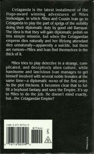 Cetaganda is the latest installment of the Hugo-award winning adventures of Miles Vorkosigan, in which Miles and Cousin Ivan go to Cetaganda to play the part of sprigs of the nobility doing their diplomatic duty by good old Barrayar. The idea is that they will gain diplomatic polish on this simple mission, but when the Cetagandan empress dies naturally and her lifelong attendant dies unnaturally - apparently a suicide, but there are rumors - Miles and Ivan find themselves in the thick of it. Miles tries to play detective in a strange, complicated, and deceptively alien culture. Meanwhile, handsome and lascivious Ivan manages to get himself involved with several women at the same time - all of whom are TROUBLE from the word go. Miles had always wanted to save the Empire - it was just that the Cetagandan wasn't exactly the empire he'd had in mind...