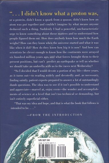 One of the world’s most beloved writers and New York Times bestselling author of A Walk in the Woods and The Body takes his ultimate journey—into the most intriguing and intractable questions that science seeks to answer.In A Walk in the Woods, Bill Bryson trekked the Appalachian Trail—well, most of it. In A Sunburned Country, he confronted some of the most lethal wildlife Australia has to offer. Now, in his biggest book, he confronts his greatest challenge: to understand—and, if possible, answer—the oldest, biggest questions we have posed about the universe and ourselves. Taking as territory everything from the Big Bang to the rise of civilization, Bryson seeks to understand how we got from there being nothing at all to there being us. To that end, he has attached himself to a host of the world’s most advanced (and often obsessed) archaeologists, anthropologists, and mathematicians, travelling to their offices, laboratories, and field camps. He has read (or tried to read) their books, pestered them with questions, apprenticed himself to their powerful minds. A Short History of Nearly Everything is the record of this quest, and it is a sometimes profound, sometimes funny, and always supremely clear and entertaining adventure in the realms of human knowledge, as only Bill Bryson can render it. Science has never been more involving or entertaining.