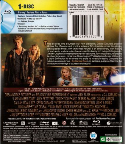 A teenage fugitive with an incredible secret races to stay one step ahead of the mysterious forces seeking to track and destroy him in this action thriller from director D.J. Caruso (Disturbia, Eagle Eye). With three dead and one on the run, the race to find the elusive Number Four begins. Outwardly normal teen John Smith (Alex Pettyfer) never gets too comfortable in the same identity, and along with his guardian, Henri (Timothy Olyphant), he is constantly moving from town to town -- the perpetual new kid in a series of strangely familiar schools. Despite the fact that his nomadic lifestyle has made it difficult to form meaningful connections, John experiences the joy of first love with a beautiful young woman (Dianna Agron) and begins to unlock his full potential after arriving with Henri in a small Ohio town. With each passing day, John gains a stronger grasp on his extraordinary new powers, and his bond to the beings that share his fantastic fate grows stronger.