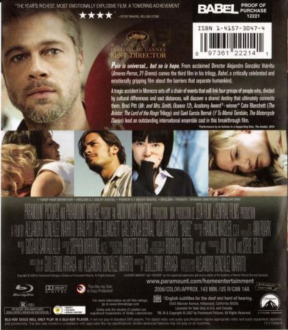 "In Gen. 11:9, the name of Babel is etymologized by association with the Hebrew verb balal, 'to confuse or confound'" (www.wikipedia.org/wiki/babel)..."Babel", through a series of misunderstandings, interweaves the unfortunate circumstances of a Moroccan, an American, a Mexican and a Japanese family. A Moroccan family acquires a rifle to protect their goats. An American woman, on a bus tour with her husband, is accidentally shot, which is in turn grossly exaggerated by the press who are quick to label the incident as a "terrorist attack". The same couple's children accompany their long-time caretaker to Mexico to attend her son's wedding, whereupon re-entering the United States face problems. A Japanese widower confronts difficulties in communicating with his deaf teenage daughter who simply craves human contact.