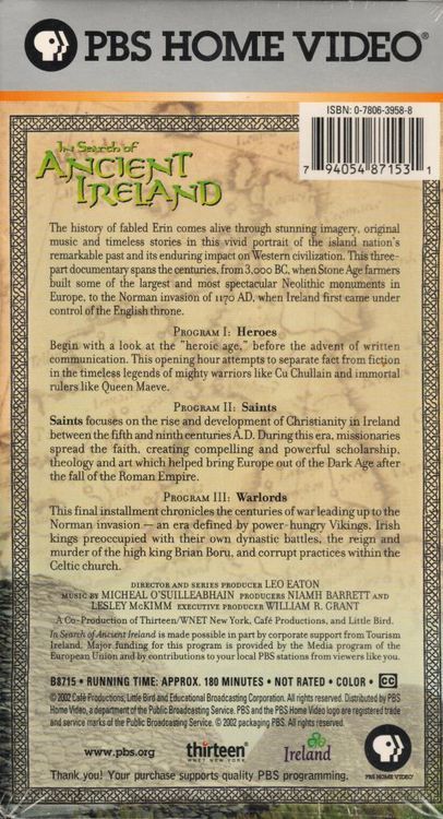 The history of fabled Erin comes alive through stunning imagery, original music and timeless stories in this vivid portrait of the island nation's remarkable past and its enduring impact of western civilization.This three part documentary spans the centuries from 3000 BC when stone age farmers built some of the largest and most spectacular Neolithic monuments in Europe, to the Norman invasion of 1170AD when Ireland first came under the control of the English throne.