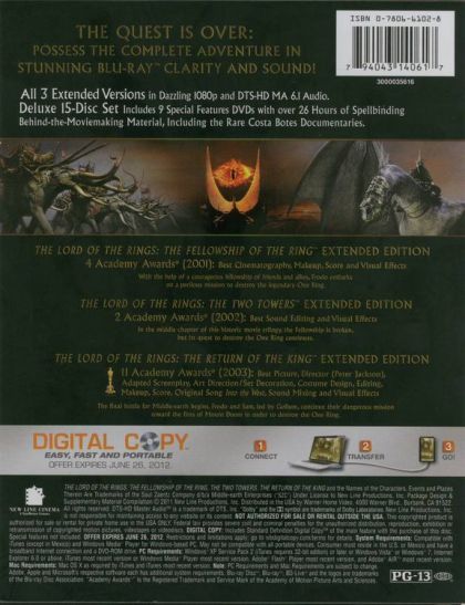 Of the four commentary tracks, the ones with the greatest general appeal are the one by Jackson and cowriters Fran Walsh and Philippa Boyens, and the one by 10 cast members, but the more technically oriented commentaries by the creative and production staff are also worth hearing. The bonus features (encompassing two complete DVDs) are far superior to the largely promotional materials included on the theatrical release, delving into such matters as script development, casting, and visual effects. The only drawback is that the film is now spread over two discs, with a somewhat abrupt break following the council at Rivendell, due to the storage capacity required for the longer running time, the added DTS ES 6.1 audio, and the commentary tracks. But that's a minor inconvenience. Whether in this four-disc set or in the collector's gift set (which adds Argonath bookends and a DVD of National Geographic Beyond the Movie: The Lord of the Rings: The Fellowship of the Ring), the extended-edition DVD is the Fellowship DVD to rule them all. --David Horiuchi